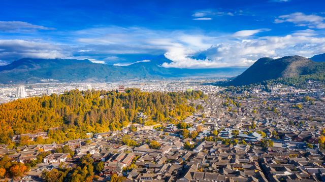 Panoramic view of the entire old town and Jade Dragon Snow Mountain