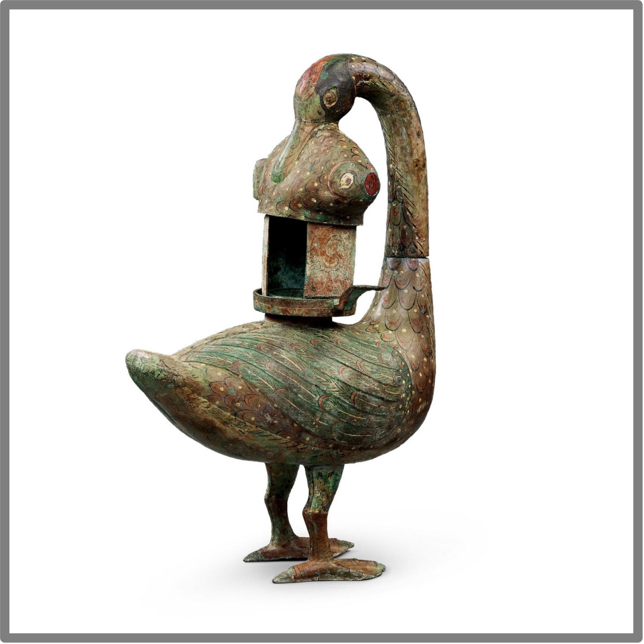 A Western Han dynasty bronze lamp in the shape of a goose holding a fish, which doubles as an ingenious ancient air purifier — the smoke from the lamp...