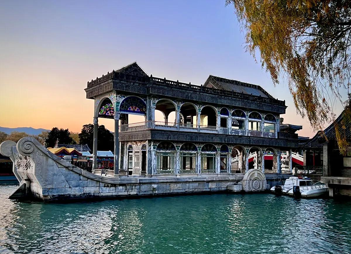 A 36-meter stone and marble boat permanently 'docked' at the lake shore, built by Emperor Qianlong and later enhanced by Empress Dowager Cixi with a W...
