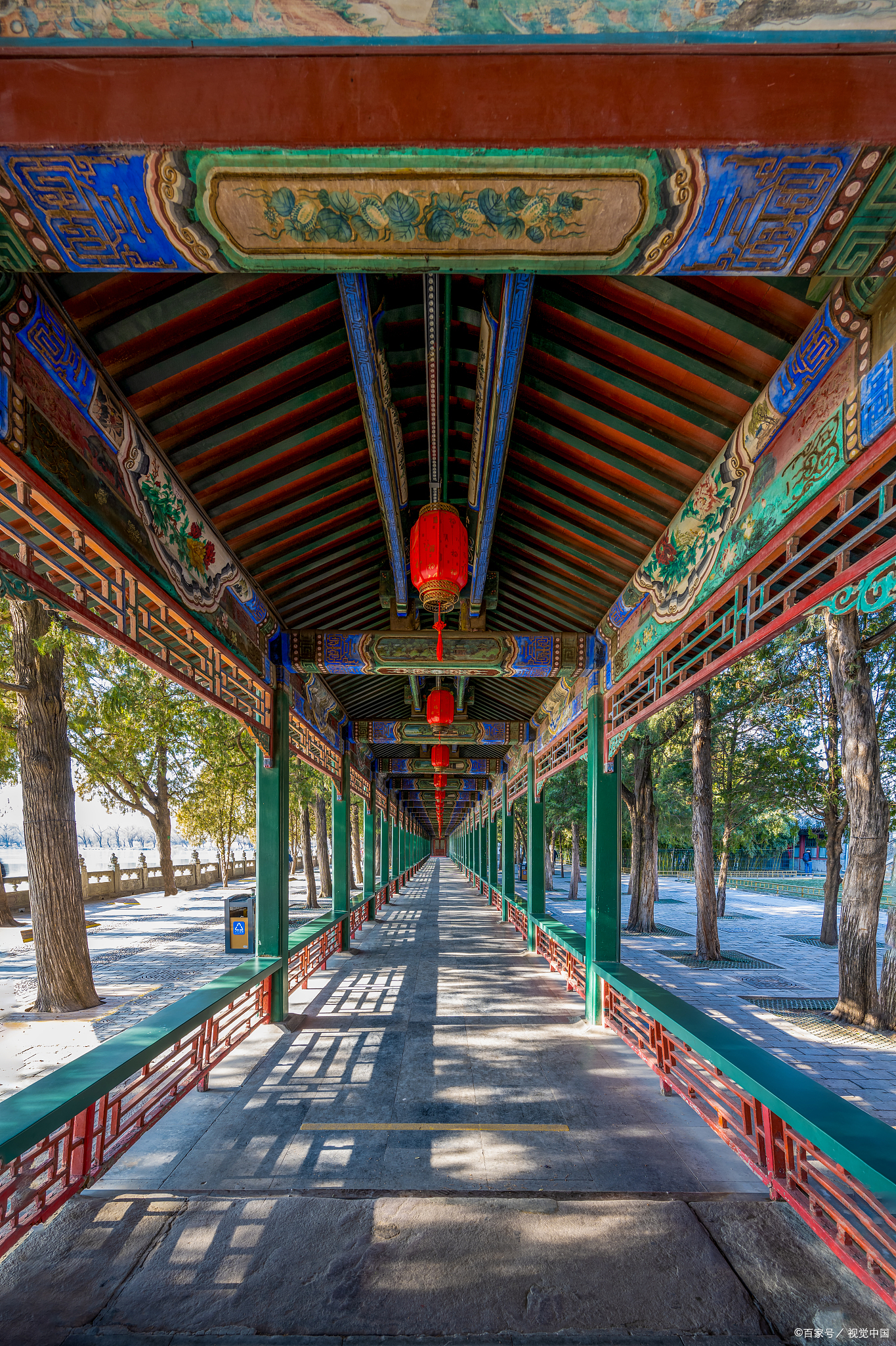 Long Corridor (长廊) looking through the painted pillars toward the lake