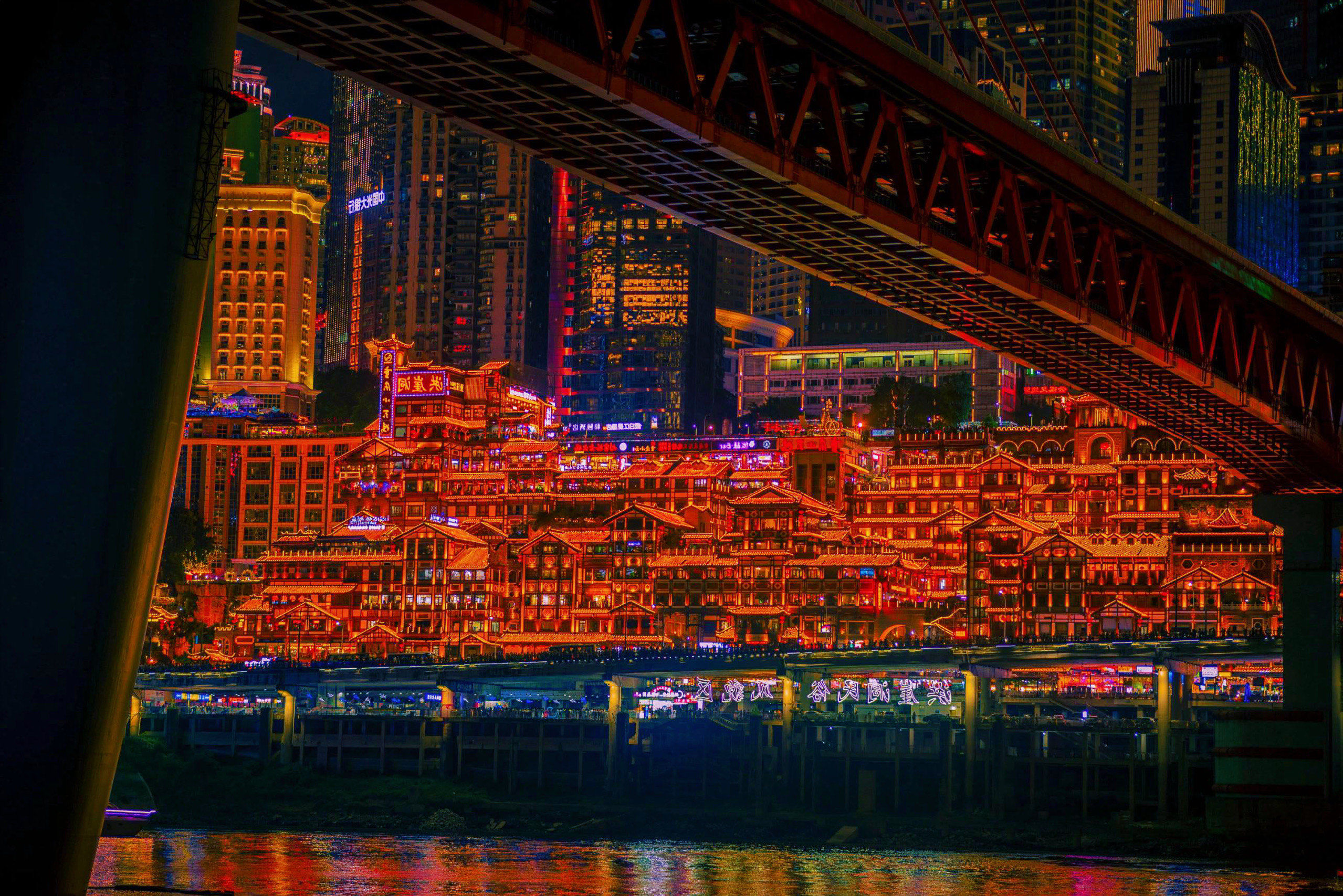 The pedestrian walkway on Qiansimen Bridge offers the most iconic view of Hongyadong — the full 11-story illuminated building complex with the Jialing River below and Chongqing's modern skyline behind it. This is THE shot that made Hongyadong internet-famous.