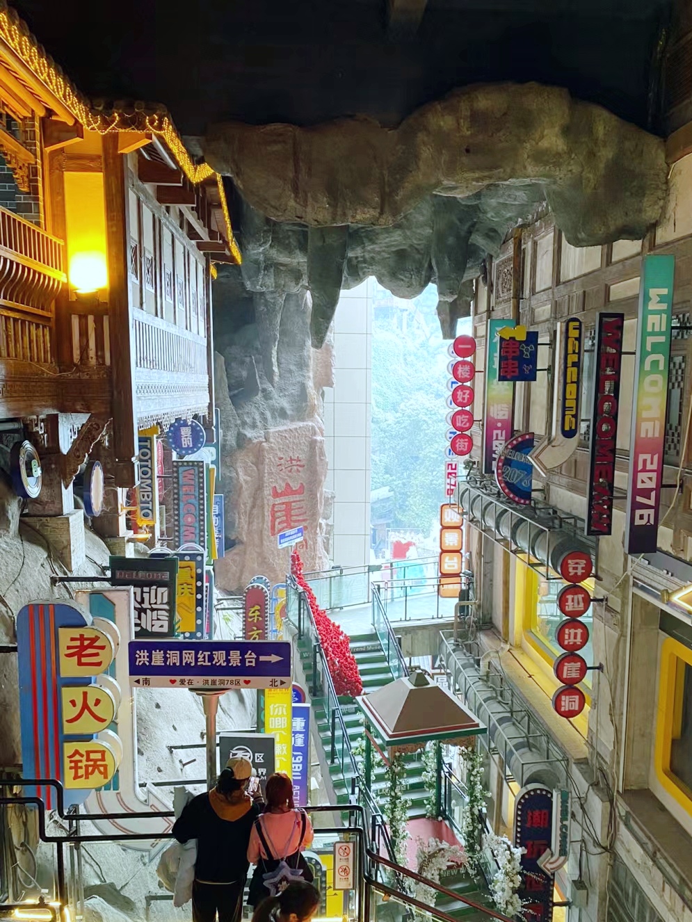 The mid-levels house a concentrated food street with Chongqing specialties — small noodles (xiaomian), hotpot, sour rice noodles, spicy skewers, and c...