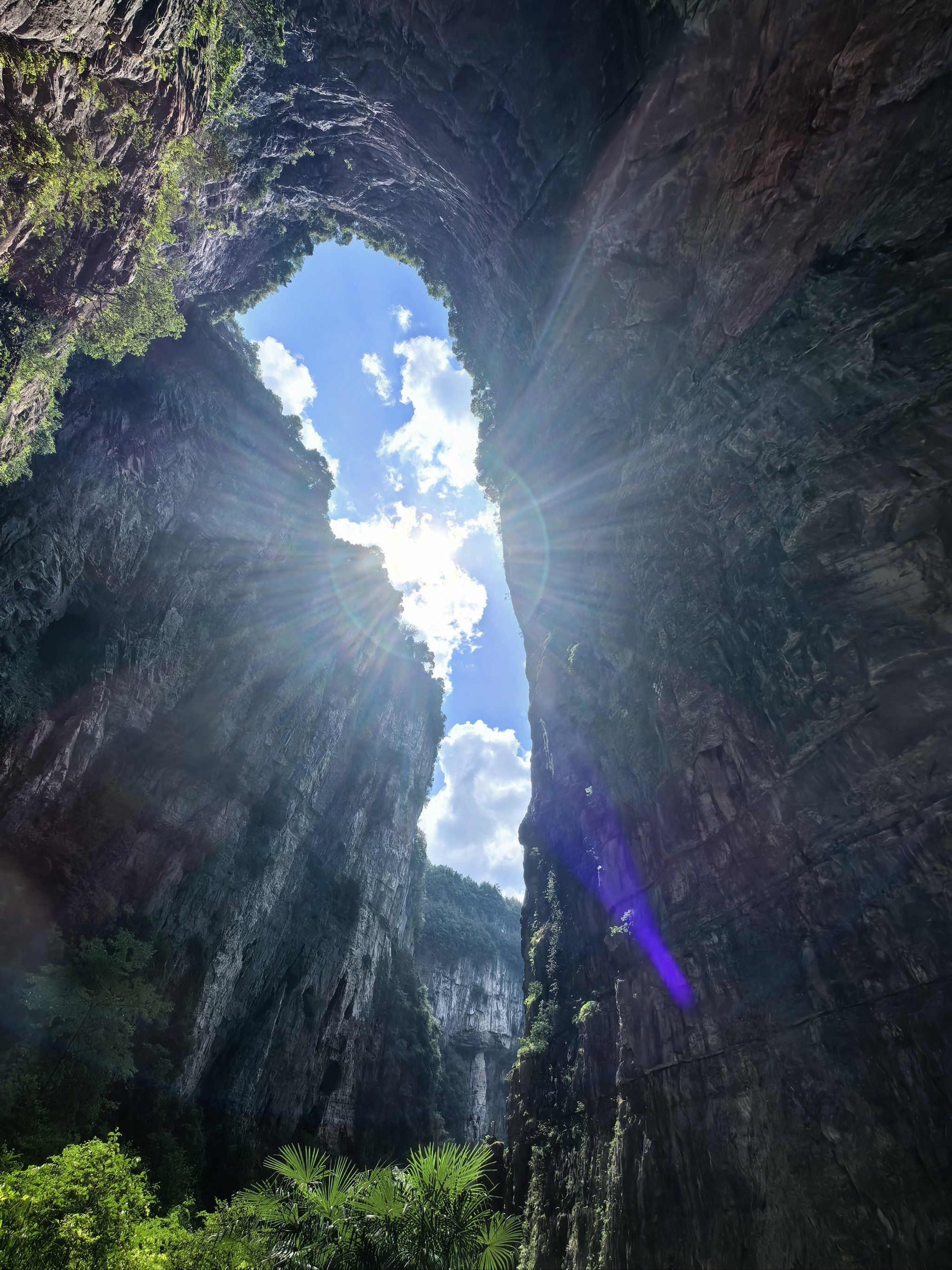 Inside the first sinkhole — looking up at Tianlong Bridge