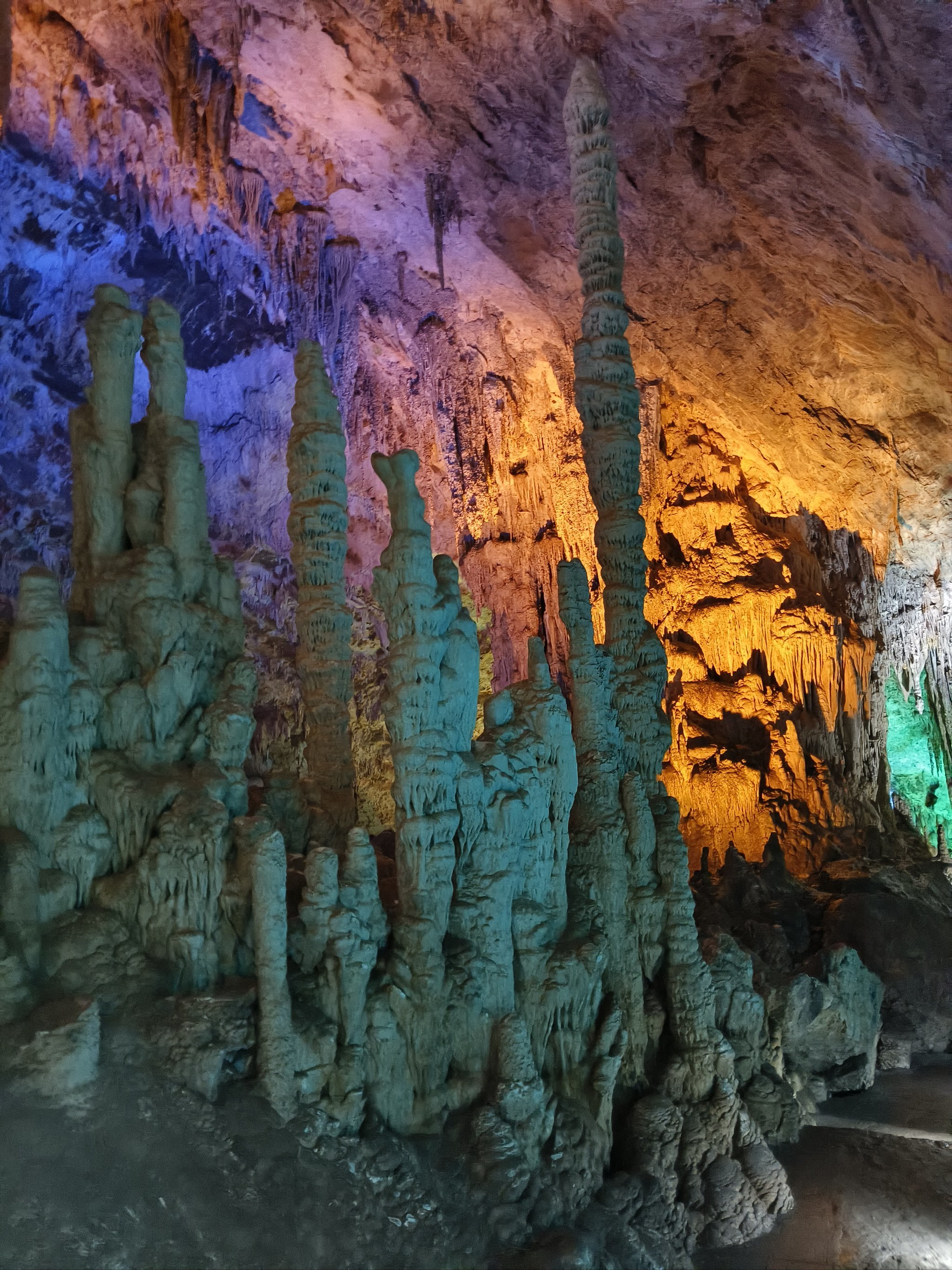 One of China's largest and most impressive karst caves, featuring stalactites, stalagmites, and calcite formations illuminated by colored lighting acr...