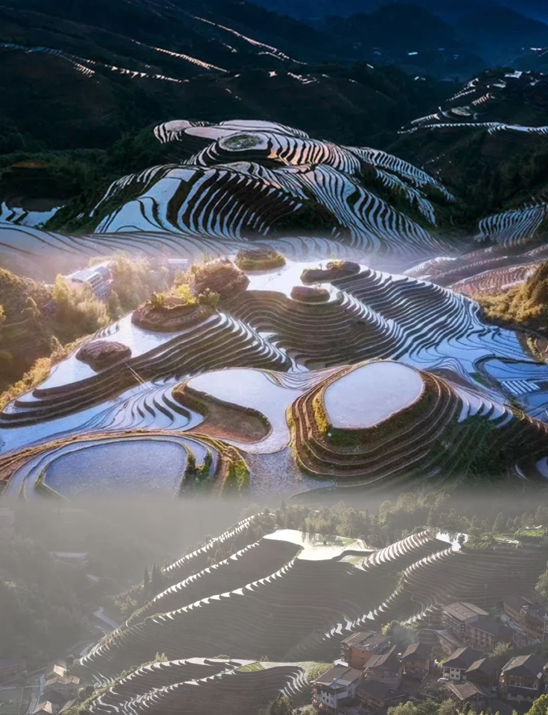 This is the image you've seen in every guidebook and travel poster. In flooded season (May-June), the pools reflect the sky. In harvest season (September-October), it's a golden mosaic.