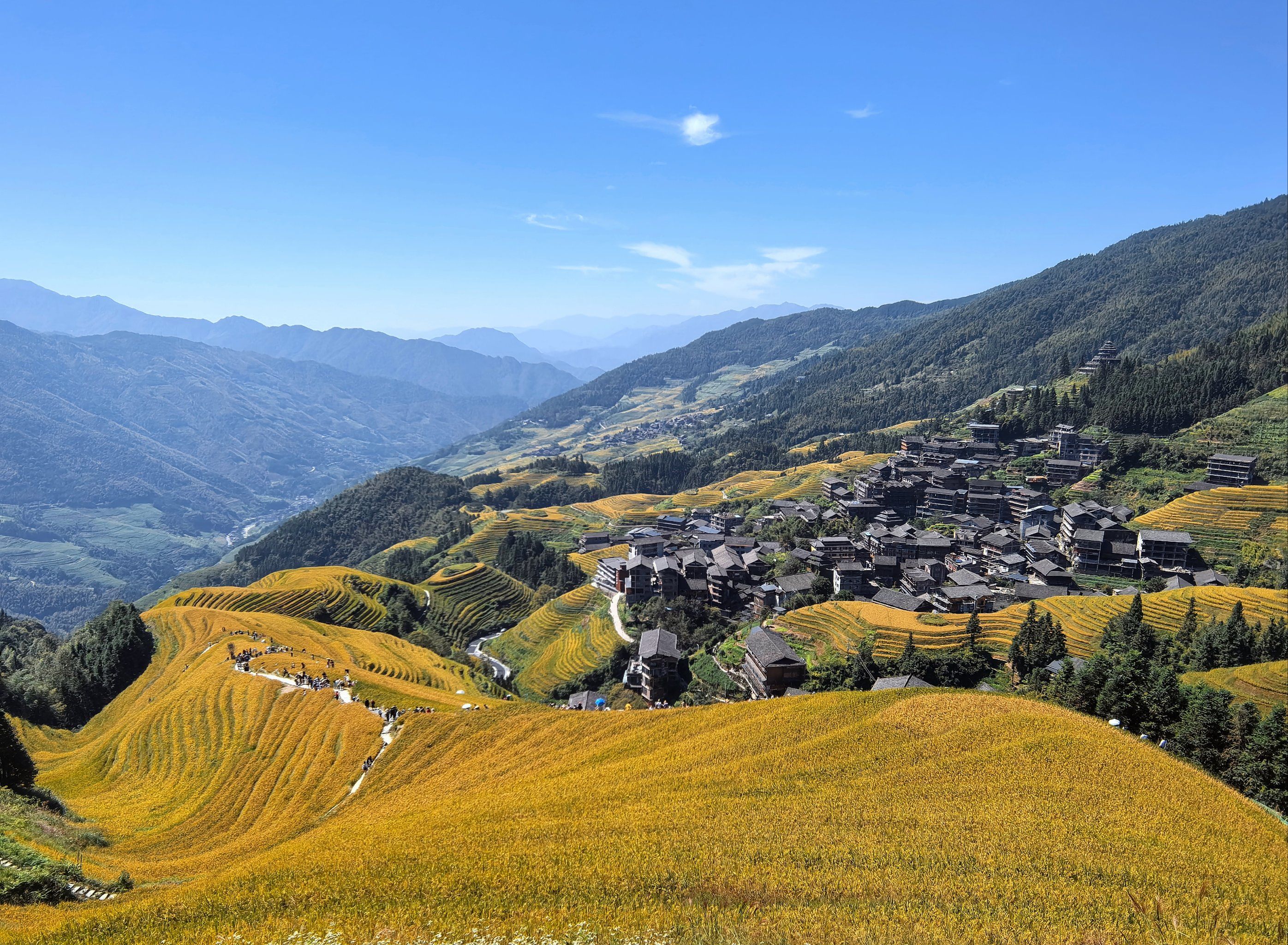 At the foot of the Ping'an terraces, this Red Yao village is famous for its women's extraordinarily long hair (Guinness record: longest group hair). Cultural performances daily. It's on the way — no detour needed.