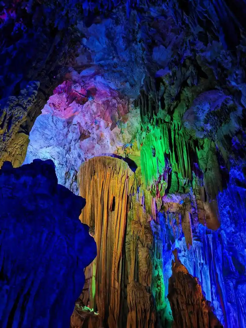 Reed Flute Cave is Guilin's most famous underground attraction — a 500-meter U-shaped walking route through a massive limestone cave system filled with stalactites, stalagmites, stone pillars, and rock formations, all illuminated by intensely colorful LED lighting. The cave has been a tourist attraction for over 1,200 years, with Tang Dynasty (792 AD) ink inscriptions still visible on the walls. The formations are genuinely impressive — some pillars soar 30+ meters, and the Crystal Palace chamber is breathtakingly large. A free Chinese-language guided tour accompanies each group, pointing out formations that resemble animals, landscapes, and mythological scenes. The cave's biggest polarizing factor is the lighting: some visitors find the rainbow-colored LEDs magical and enhancing, while others think it makes the cave look artificial and kitschy. If you prefer caves in their natural state, this may disappoint. If you appreciate the spectacle and theatricality, you'll love it. The cave is commercially managed with a clear tourist infrastructure — including a monorail to the entrance, gift shops, and somewhat aggressive vendors on exit. At 90 RMB, it's moderately expensive for what amounts to a 60-90 minute visit. Still, it's a unique Guilin experience and the formations themselves are objectively spectacular.