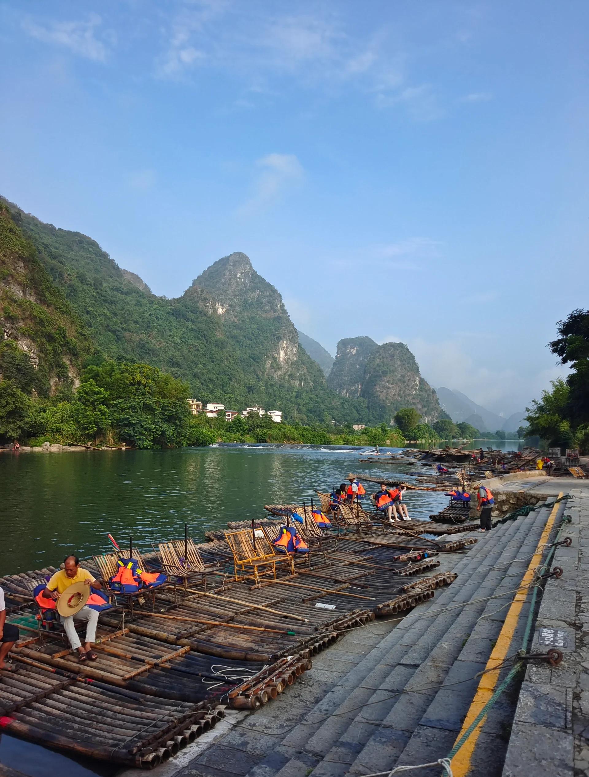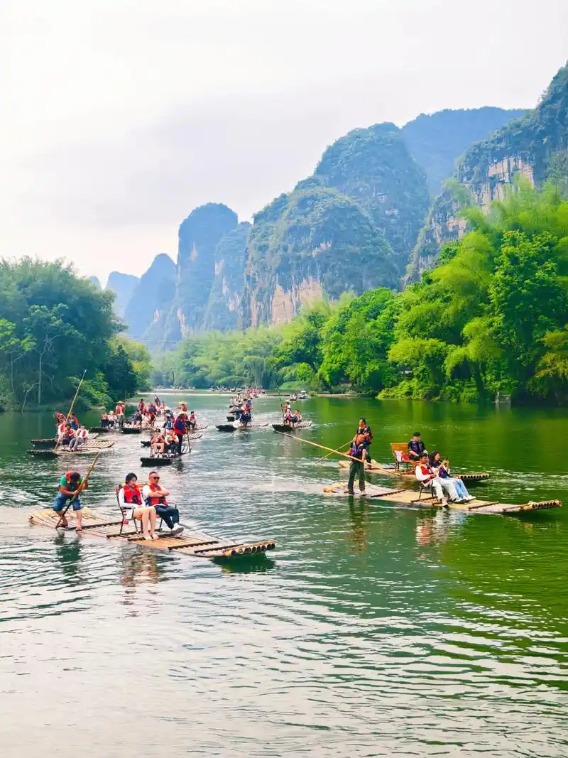 Book the Jinlong Bridge to Jiuxian route and go on a weekday. After the raft ride, rent an e-bike at Jiuxian and cycle the Ten-Mile Gallery (十里画廊) riverside path back — this combination is the quintessential Yangshuo experience.