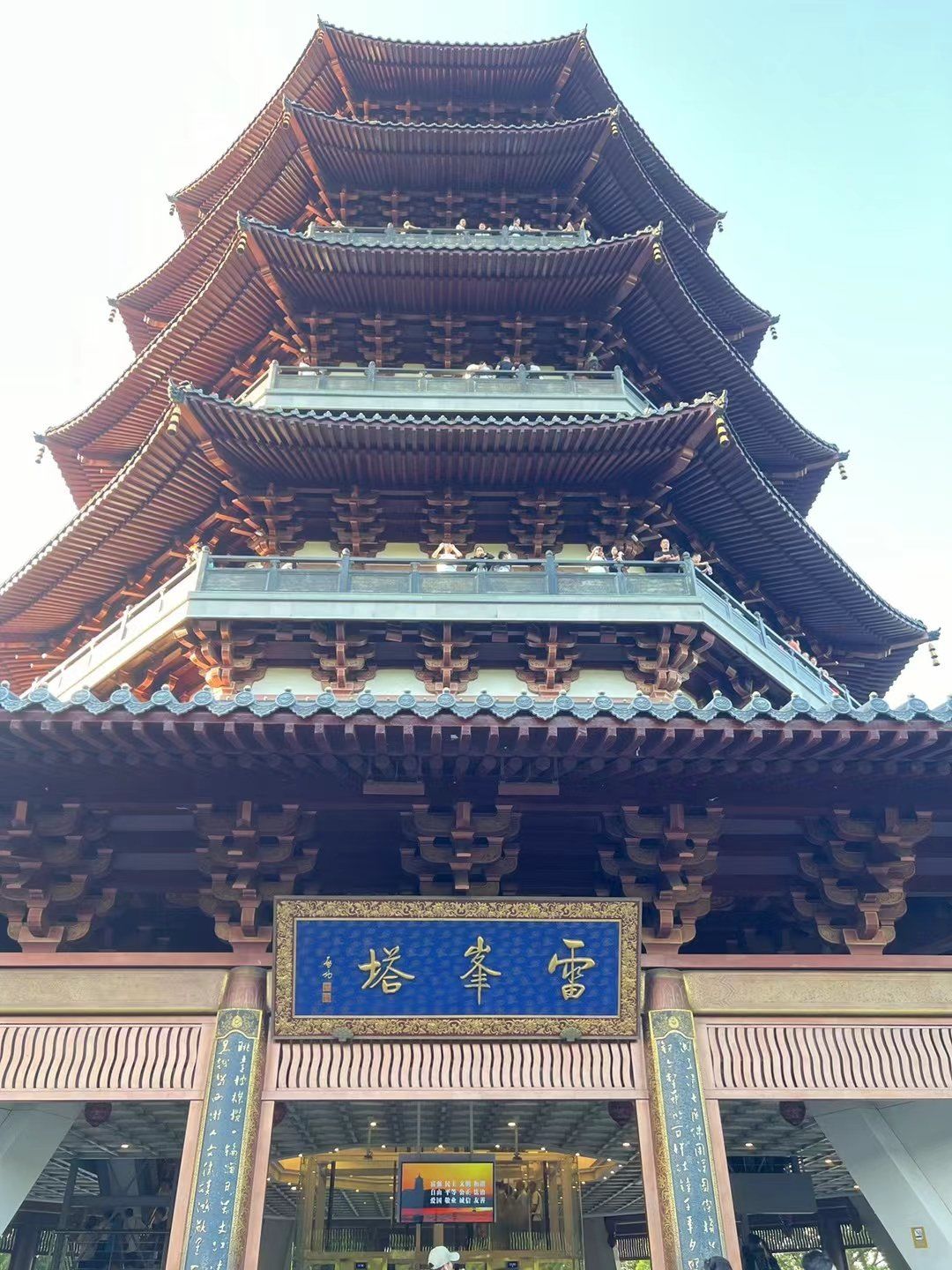 Leifeng Pagoda is a modern reconstruction (completed 2002) of a pagoda originally built in 975 AD, perched on Sunset Hill on the south shore of West Lake. It's inseparable from the Legend of the White Snake, one of China's most beloved folk tales, in which a snake spirit is imprisoned beneath the tower. The original pagoda collapsed in 1924 after centuries of damage from Japanese pirates, superstitious brick-robbers, and neglect -- an event that Lu Xun famously wrote about as a symbol of feudalism's fall. The current 71.7-meter tower is honestly a thoroughly modern building: steel frame, copper cladding, elevators, escalators, air conditioning, and multimedia displays. If you're expecting an ancient ruin, you'll be disappointed -- this is more museum-tower than historic pagoda. That said, it does two things brilliantly: the ground floor preserves the actual ruins of the original pagoda behind glass, creating a genuine 'tower built over a tower' effect, and the top floor delivers what many consider the single best panoramic view of West Lake. The wooden carvings depicting the White Snake legend inside are beautifully crafted. The sunset views ('Leifeng Sunset Glow' is one of the Ten Scenes of West Lake) are genuinely spectacular. At 40 RMB, it's reasonably priced for what you get. The escalators and elevators make it accessible for everyone. It's a pleasant 1-2 hour experience that most Hangzhou visitors enjoy, even if architecture purists find the modern reconstruction lacking in soul.