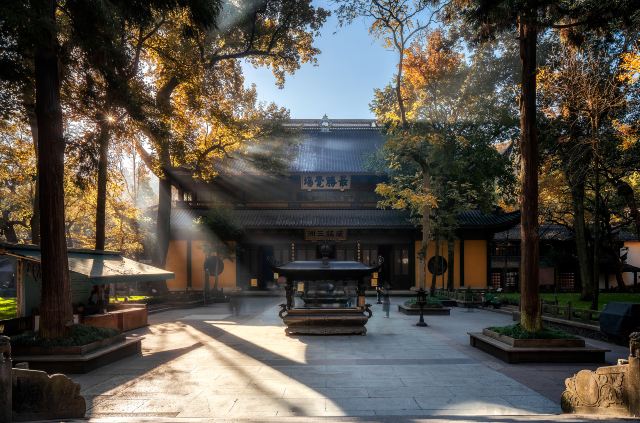 The temple offers a free incense-lighting experience inside — look for the distribution point after entering. If you're interested in Buddhism, morning chanting sessions are open to visitors (arrive before 7:30 AM). The Cold Spring Pavilion (冷泉亭) near the stream is a peaceful rest spot. Take bus Y1 or Y2 to the entrance to avoid traffic gridlock.