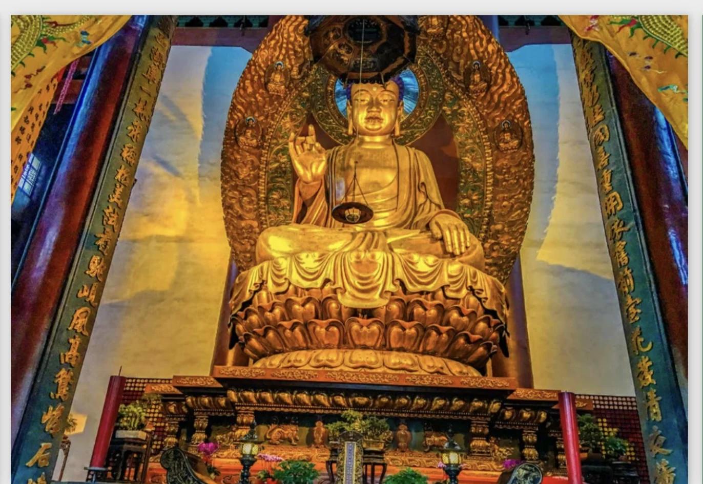 The main hall houses one of China's tallest wooden Buddha statues — a 24.8-meter camphorwood Sakyamuni in lotus position. Behind it, the 'Island of Bu...