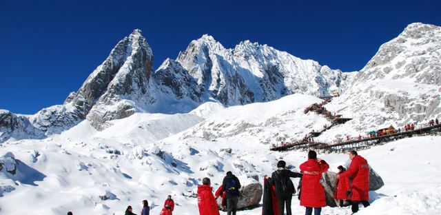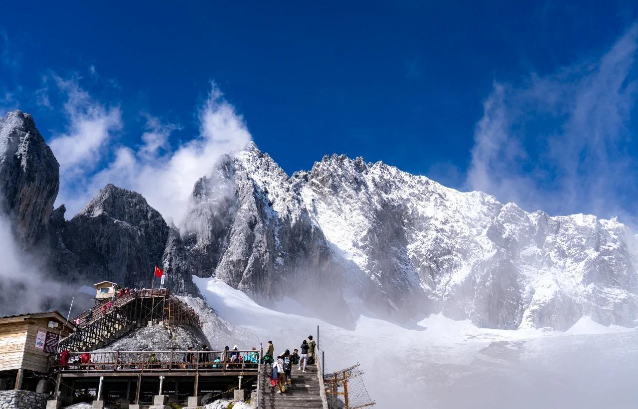 Jade Dragon Snow Mountain is the crown jewel of Lijiang tourism and China's most accessible high-altitude glacier experience. A cable car whisks you from 3,356 meters to 4,506 meters in about 10 minutes, and from there you can climb wooden boardwalks to a 4,680-meter viewpoint — one of the highest publicly accessible points in any mountain park worldwide. The views on a clear day are genuinely spectacular: snow-capped peaks against impossibly blue skies, seas of clouds breaking across ridges, and the full sweep of thirteen interconnected summits stretching like a dragon's spine. The mountain is sacred to the Naxi people, who call it 'Oulu' (Heavenly Mountain), and it forms part of the UNESCO Three Parallel Rivers Protected Areas. Below the glacier, Blue Moon Valley offers a stunning contrast — glacial melt lakes in surreal shades of turquoise and jade green. The infrastructure is excellent but the crowds are punishing: expect 10,000 visitors daily, queues of 1-3 hours for cable cars in peak season, and every photo spot packed with tourists in rented ethnic costumes. Altitude sickness is real and hits many visitors hard — people vomiting, fainting, and being carted to oxygen rooms is a regular sight at the summit. The ticketing system is deliberately complicated, heavily favoring Chinese ID holders, and foreigners often find themselves shut out of glacier park cable car tickets unless they book through a tour operator. It is heavily commercialized with overpriced oxygen, jacket rentals, and tour operators who pad the experience with shopping stops. But none of that changes the fundamental fact: standing at 4,680 meters with the glacier right there, breathing thin air under a blazing sun, is a genuinely unforgettable experience.