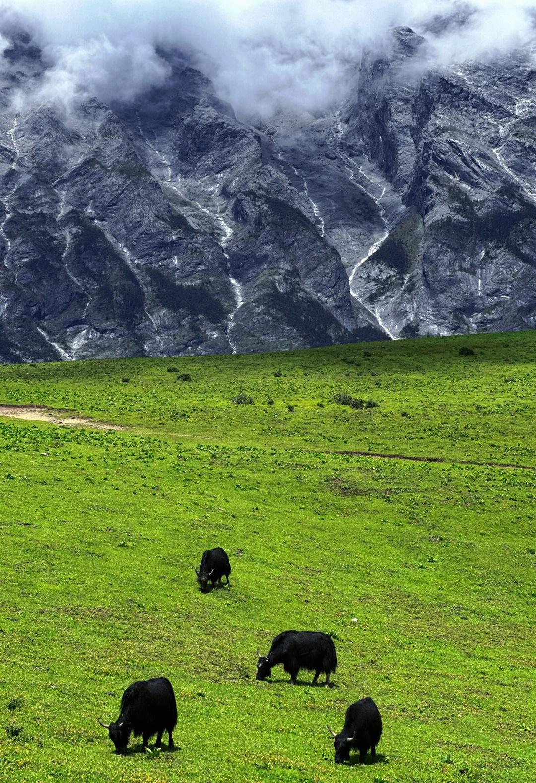 An alpine meadow at 3,700m with grazing yaks, a Tibetan Buddhist temple (Snow Flower Temple), and panoramic views of all thirteen peaks of the Jade Dr...