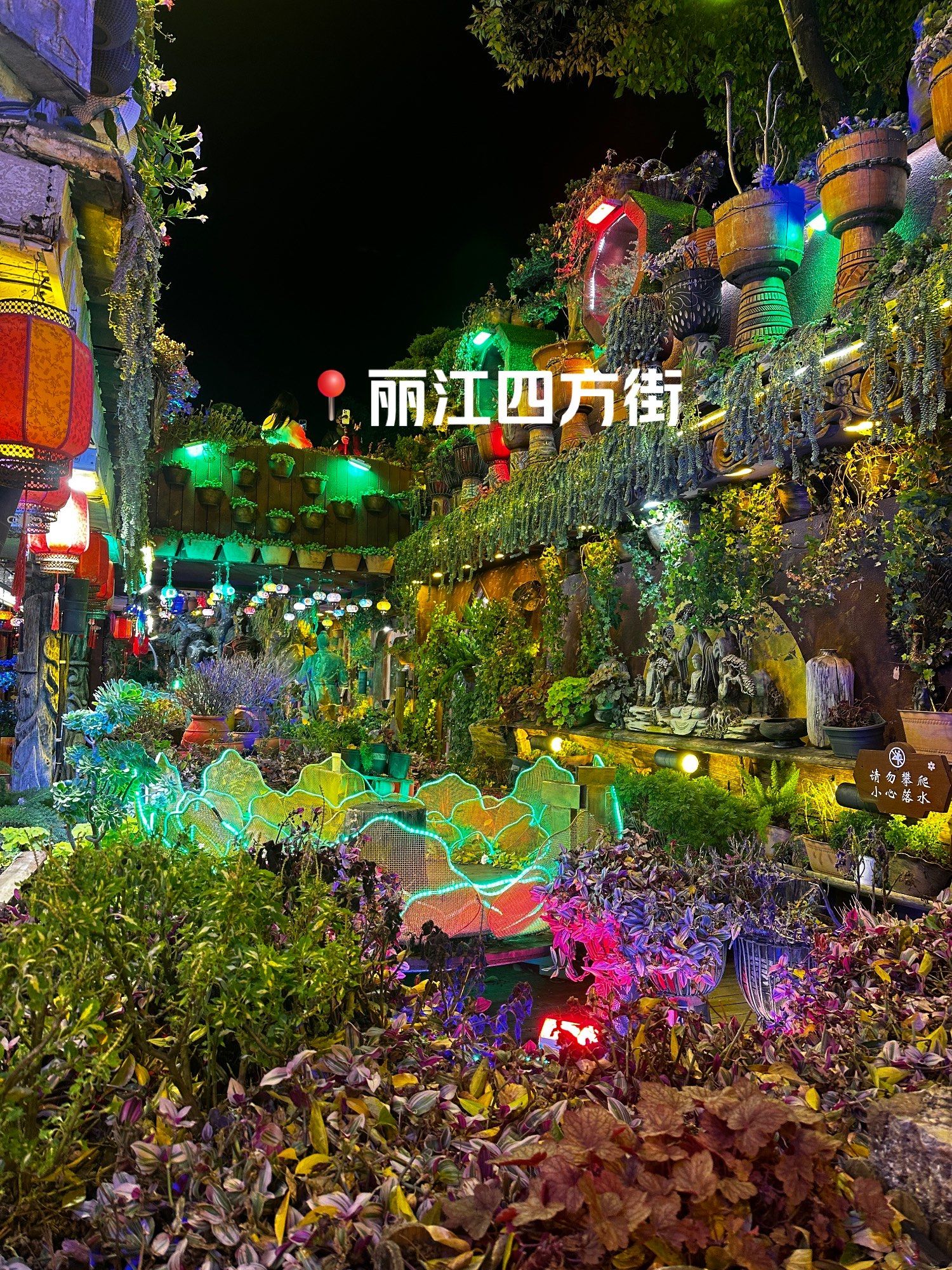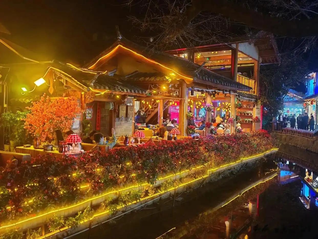 The stretch along the canal near Sifang Street transforms after dark into Lijiang's famous nightlife scene — dozens of bars with live bands, folk sing...