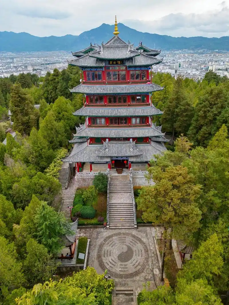 The highest point in the old town, topped by a 32.8-meter all-wood tower offering 360-degree views of the ancient rooftops and, on clear days, Jade Dr...