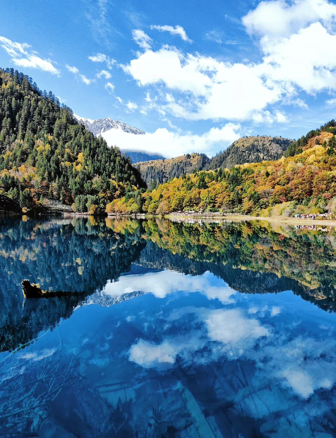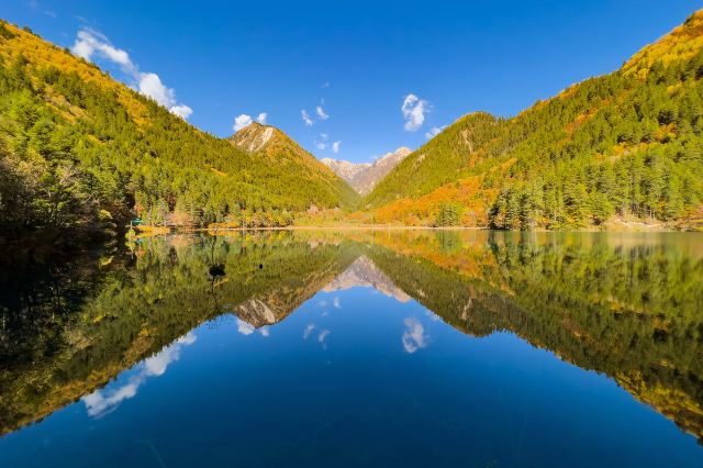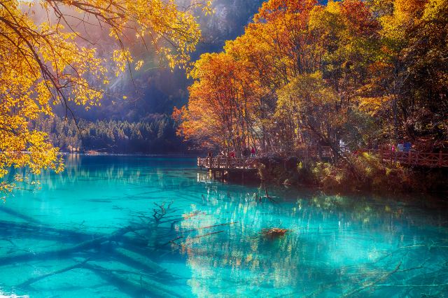 This lake is consistently rated as the single most beautiful sight in Jiuzhaigou. The colors are not enhanced — they genuinely look like this, especially in autumn when red and gold foliage frames the impossible blue water.