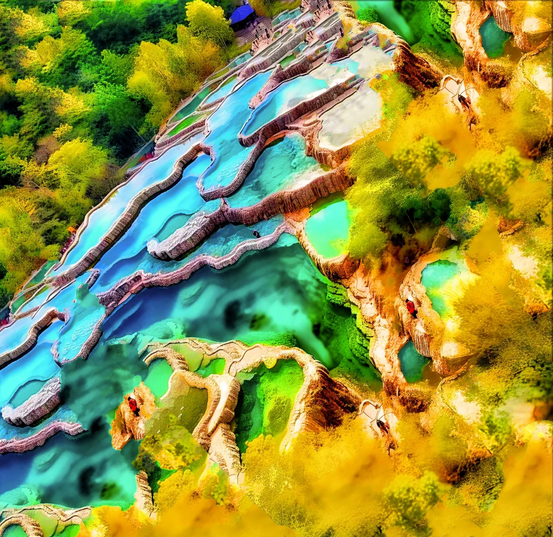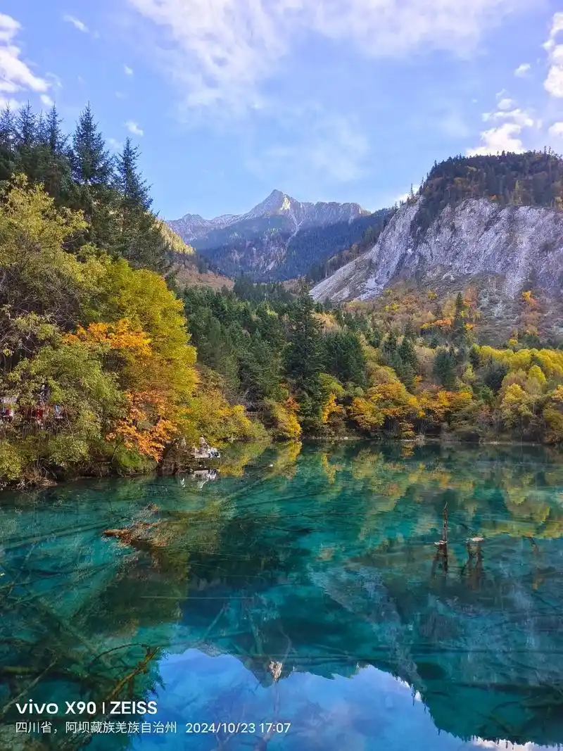 The crown jewel of Jiuzhaigou — a lake whose waters display an impossible palette of turquoise, emerald, gold, and sapphire simultaneously, created by calcium carbonate deposits, algae, and submerged ancient tree trunks visible through crystal-clear water.