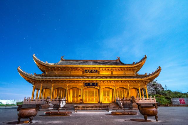 Arrive 30 minutes before sunrise. Shoot east toward the rising sun with the sea of clouds below. The golden Puxian statue is behind you — turn around after sunrise for golden-hour light on the statue.
