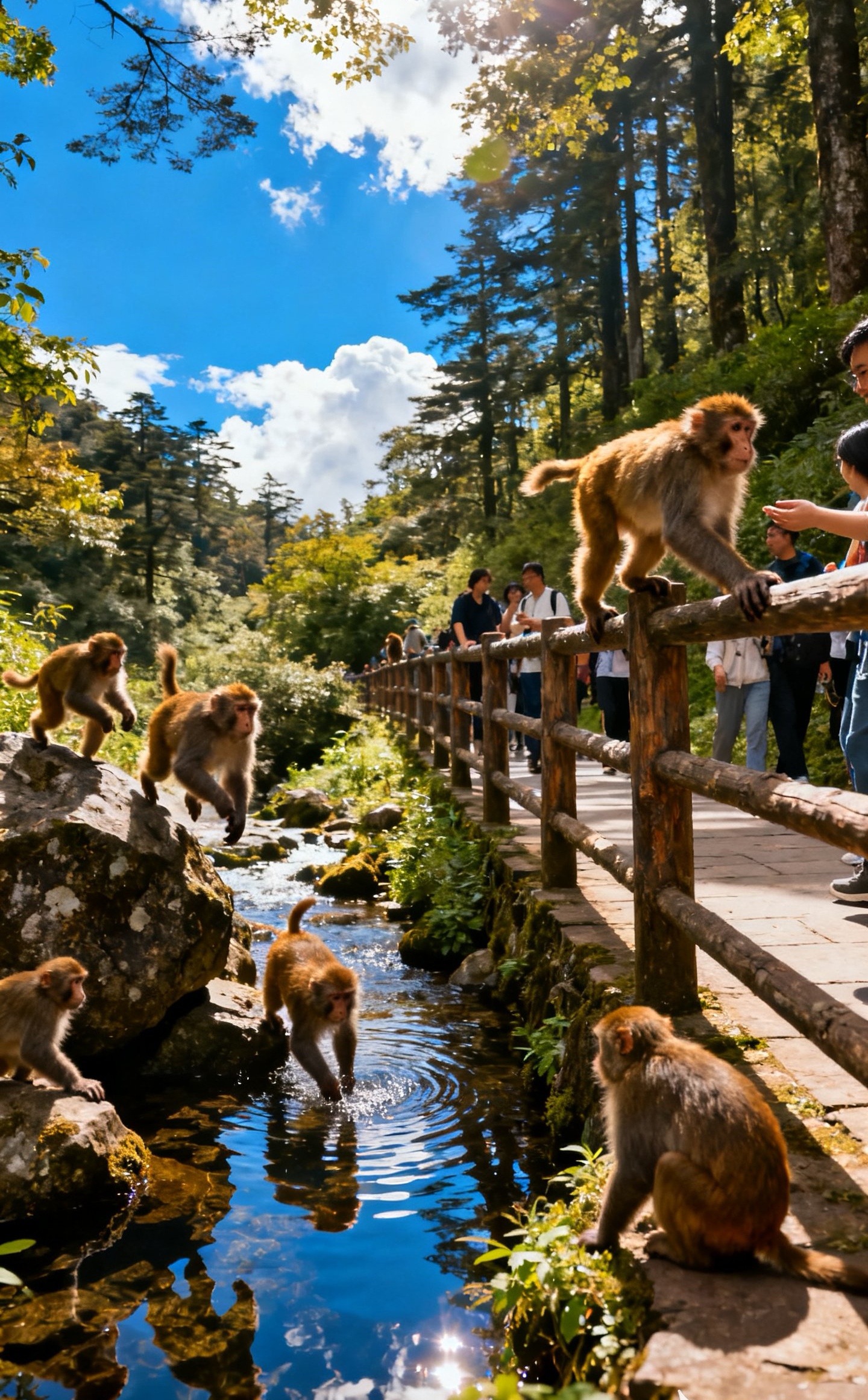 Tibetan macaques are wild animals and can bite or scratch. Keep all bags closed, don't carry food in view, hide shiny objects. If a monkey climbs on you, stay still and let park staff handle it. Don't make eye contact or show teeth (they interpret it as a threat).