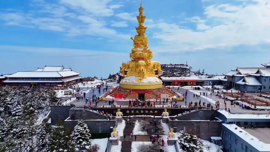 The crown of Mount Emei at 3,079 meters — a dramatic summit platform featuring the 48-meter gilded bronze Puxian Bodhisattva statue (the world's tallest golden Buddha), the Golden Temple, Silver Temple, and Bronze Temple. On clear days, the panoramic view extends to the snowy peaks of western Sichuan.