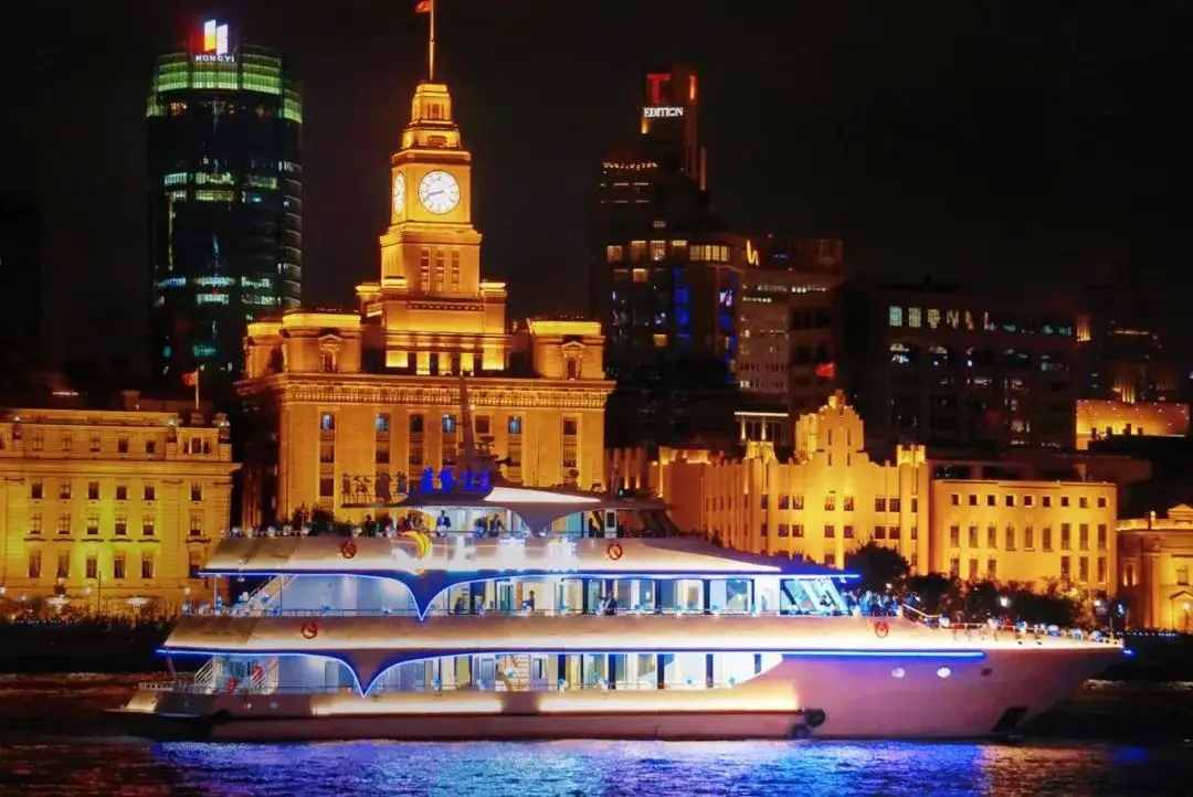 From the river, the full facade of the Bund's 52 heritage buildings illuminates in warm golden light — the HSBC Building, Customs House with its clock tower, the Fairmont Peace Hotel, and dozens more. This is the view you cannot get from standing on the Bund itself, and it's the primary reason the cruise exists.