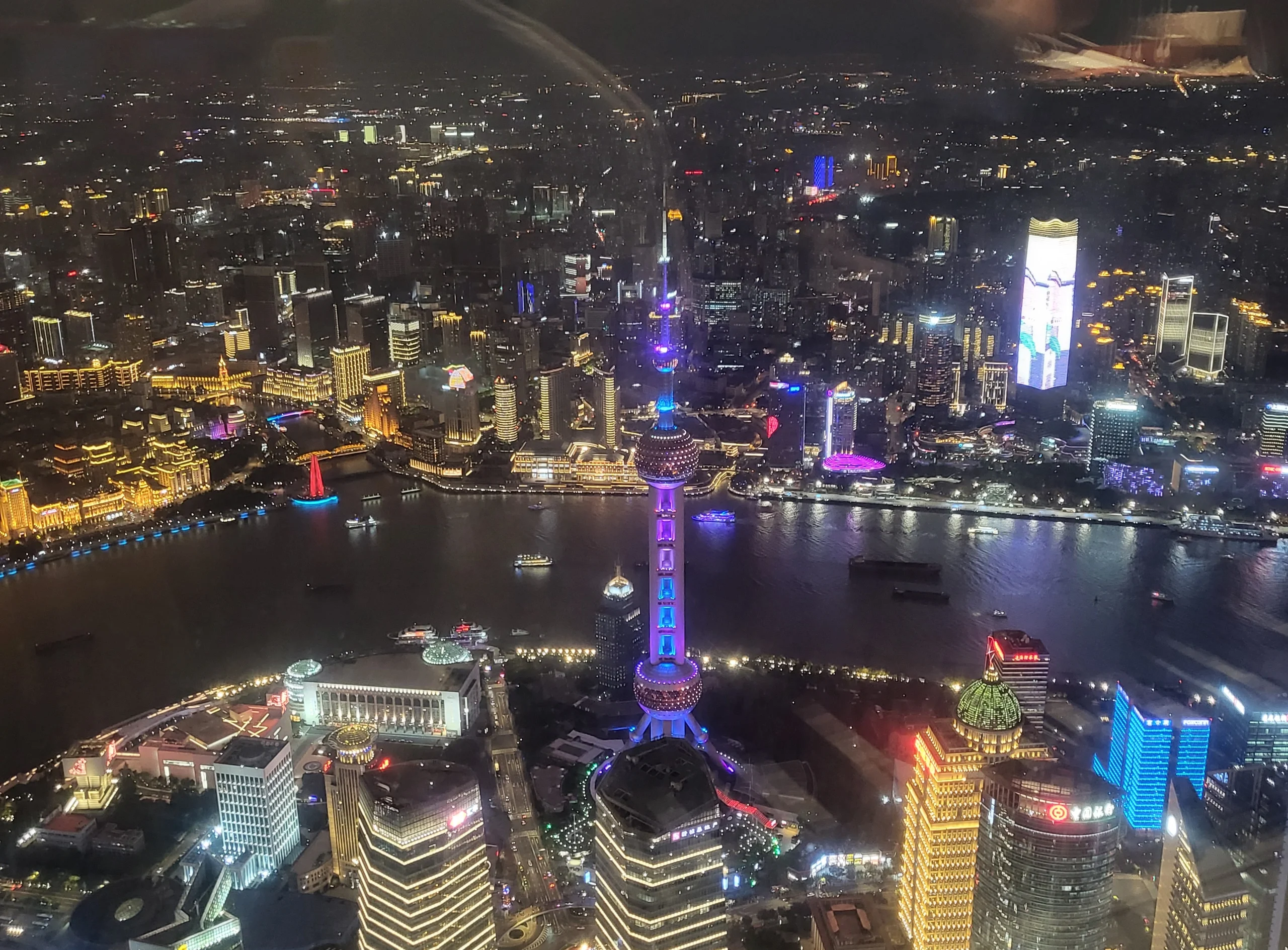 This is the highest observation deck in China and one of the highest in the world. Looking DOWN at the 421-meter Jinmao Tower and 492-meter 'Bottle Opener' puts the scale in perspective — they look like toy buildings.