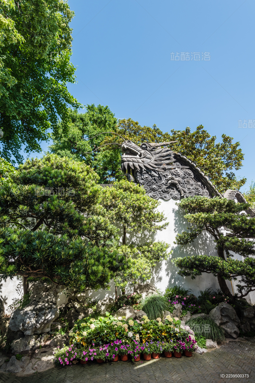 Five decorative walls throughout the garden topped with undulating dragon sculptures that appear to swim along the wall crests. Each dragon is slightl...