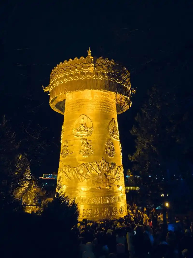 A massive golden prayer wheel atop Guishan Hill — 21 meters tall, weighing 60 tonnes, containing millions of inscribed mantras and sutras. Turning it requires the cooperative effort of multiple people pushing together, creating a uniquely communal spiritual moment.