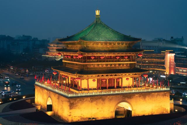 Visit on a weekday evening. After photographing the Bell Tower, walk 200 meters west to the Drum Tower, then duck into the Muslim Quarter behind it for dinner — this is the classic Xi'an evening route.