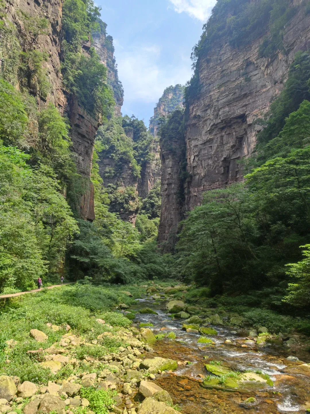 Start from the Shuirao Simen end (reached by park shuttle bus) and walk south toward the Forest Park Gate. Most tour groups walk north from the Forest Park entrance, so walking against the flow means a much quieter experience.